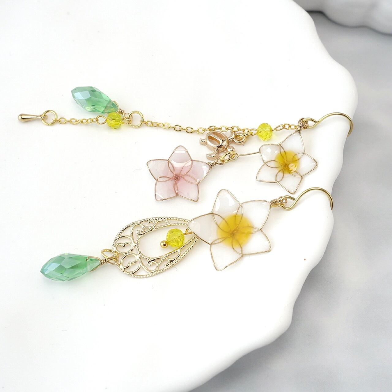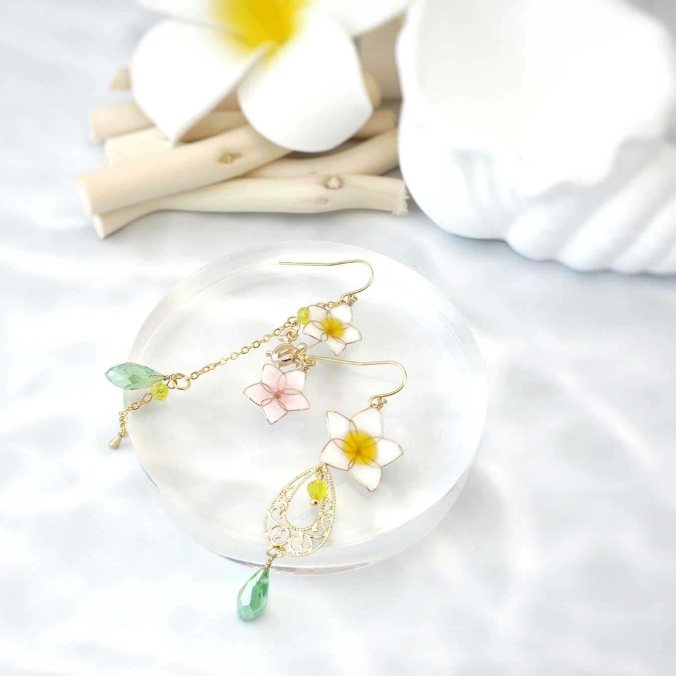 左右で異なるデザインが楽しめるこのピアスは、白とピンクのプルメリアが優雅に揺れ、見る人を惹きつけます。