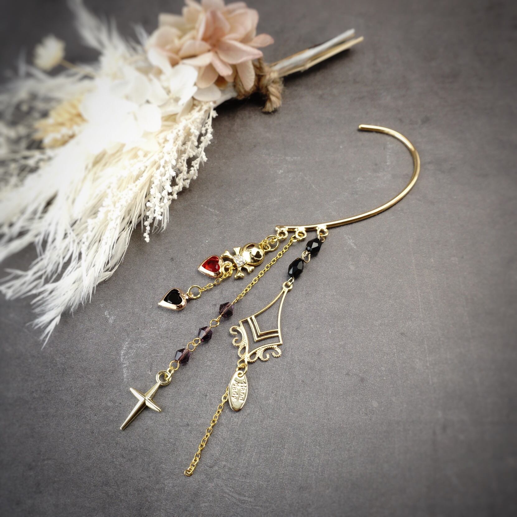 #ギフトラッピング #無料ラッピング #イヤーフック #ハロウィン #どくろ #クロス #赤と黒のハート #ロング #普段使い #手作り #揺れる