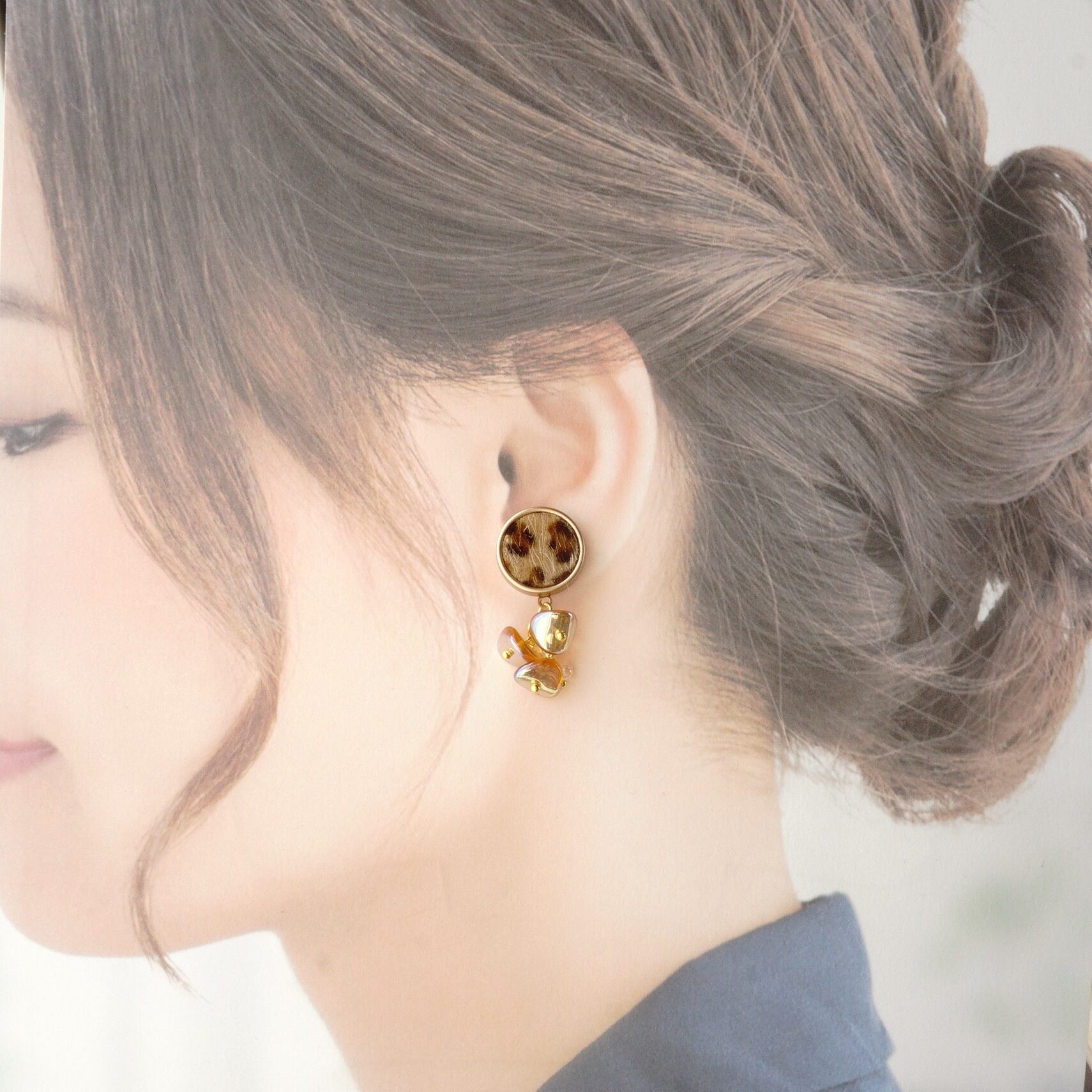 秋冬シーズンにぴったりなレオパードファーと琥珀色ビーズを組み合わせたピアスはいかがでしょうか?