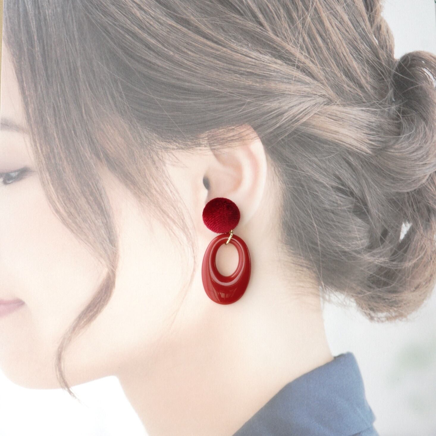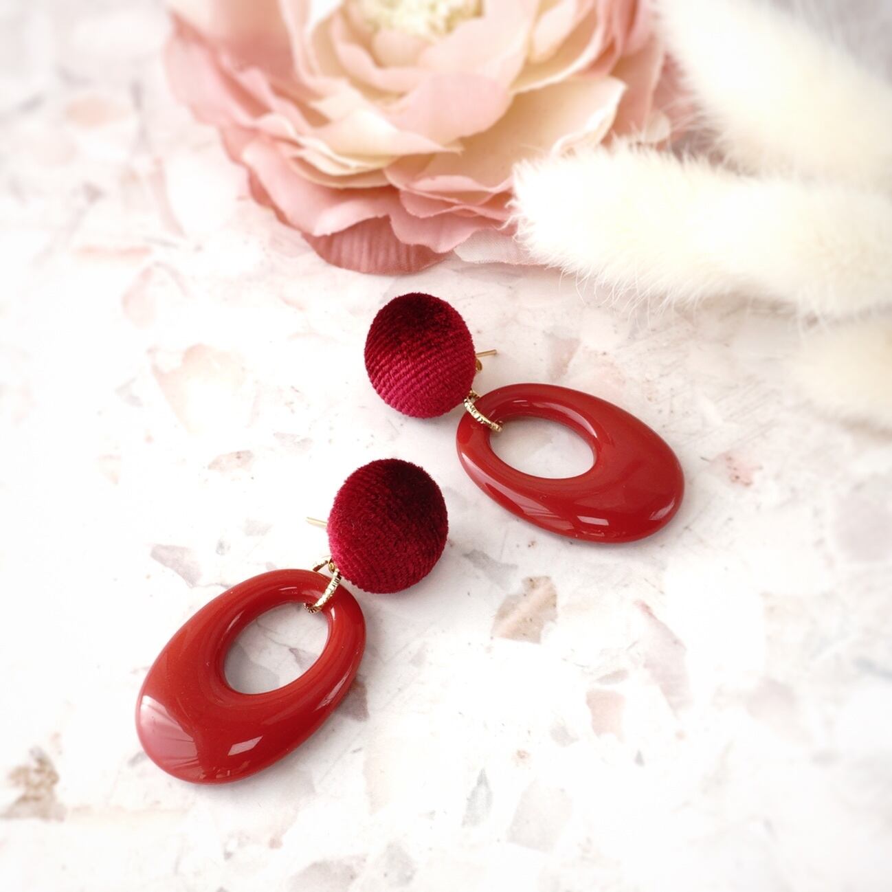 #ギフトラッピング #レッド #しずく #カボション #ノンホールピアス #冬 #イヤリング #秋冬コーデ #ワインレッド #フープ #ベロア #赤 #大ぶり #クリスマス #秋 #ボルドー #ふわもこ #ファブリック