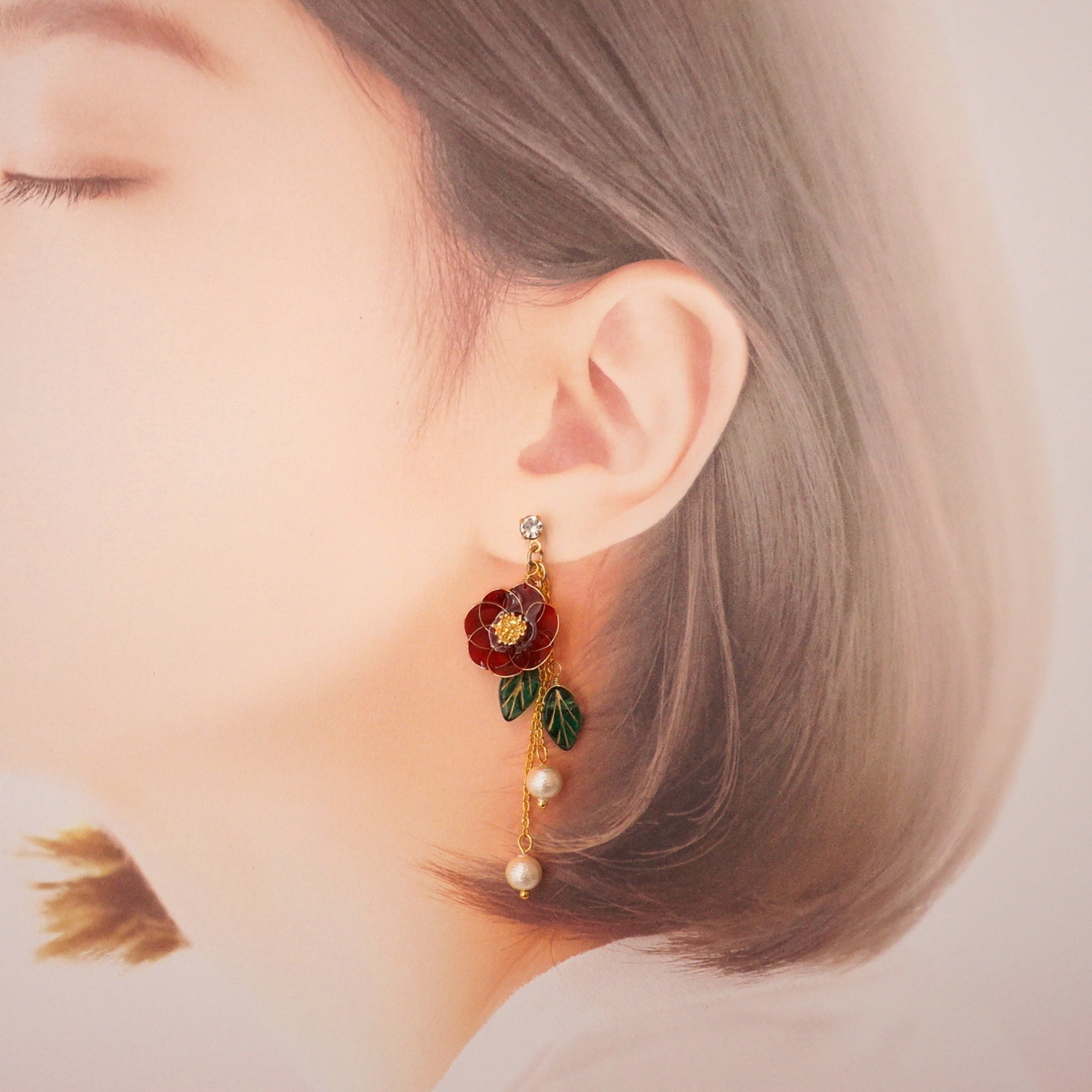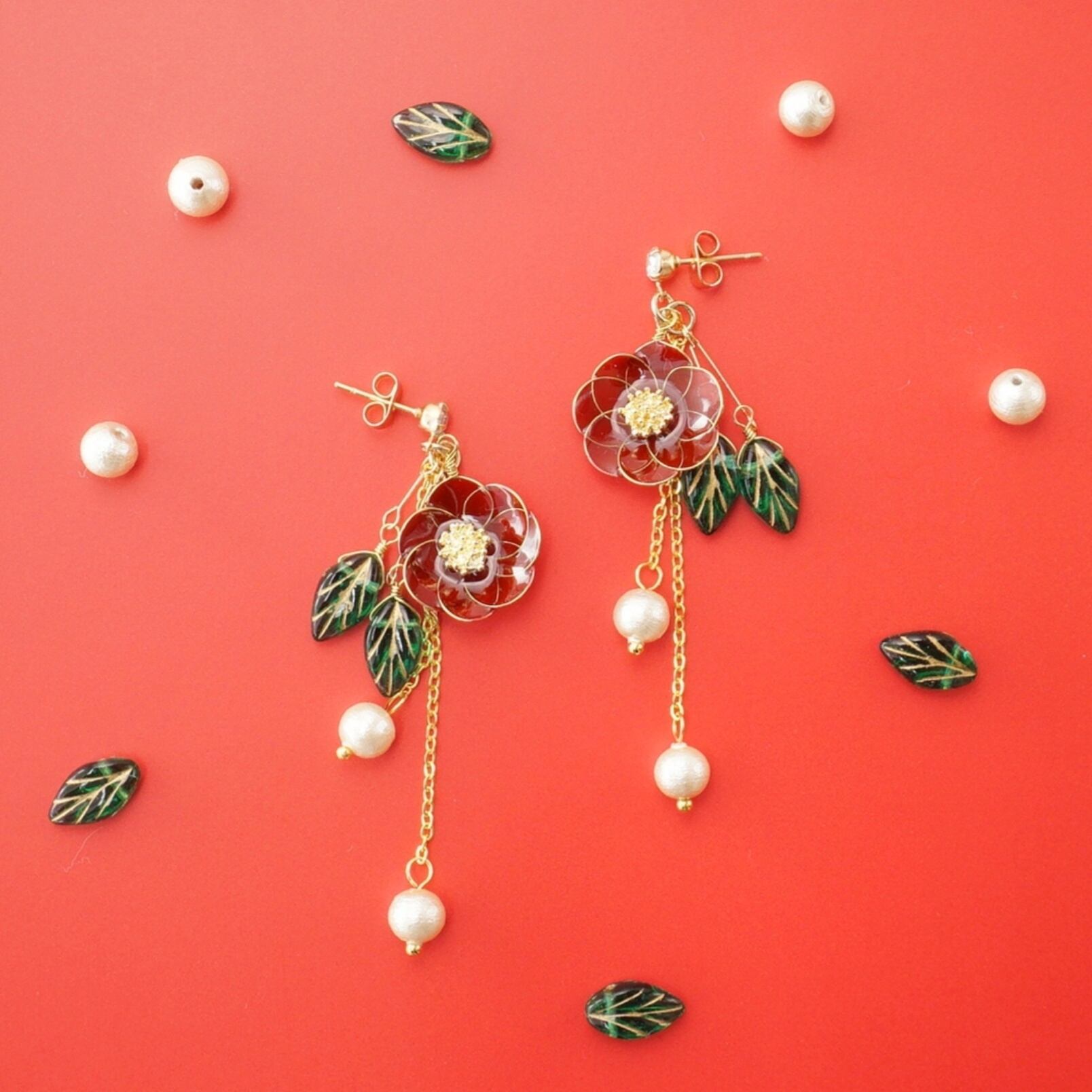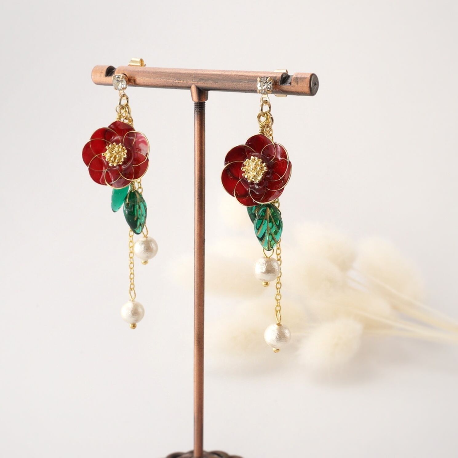 イヤリング ノンホールピアス サージカルステンレス ギフトボックス ギフトラッピング 無料ラッピング 秋冬 冬 冬物 パール コットンパール 赤 レッド 椿 つばき 雪 和風 ディップアート レジン 初詣 カサブランカ 和装 成人式 和服 着物
