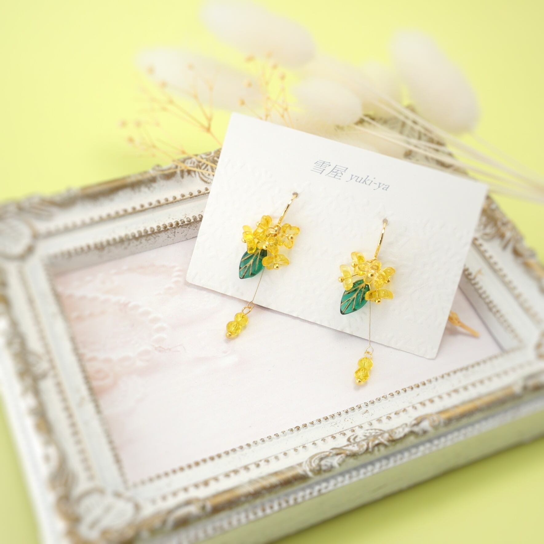 ギフトラッピング ギフトボックス アレルギー対応 樹脂ノンホールピアス ノンホールピアス イヤリング 揺れる 大人可愛い クリア パーツ変更 ガラス ガラスビーズ チェコビーズ 花 フラワー しずく k16gp デザインピアス 菜の花 色違い 黄色 イエロー 金木犀 オレンジ 小花 春 春物