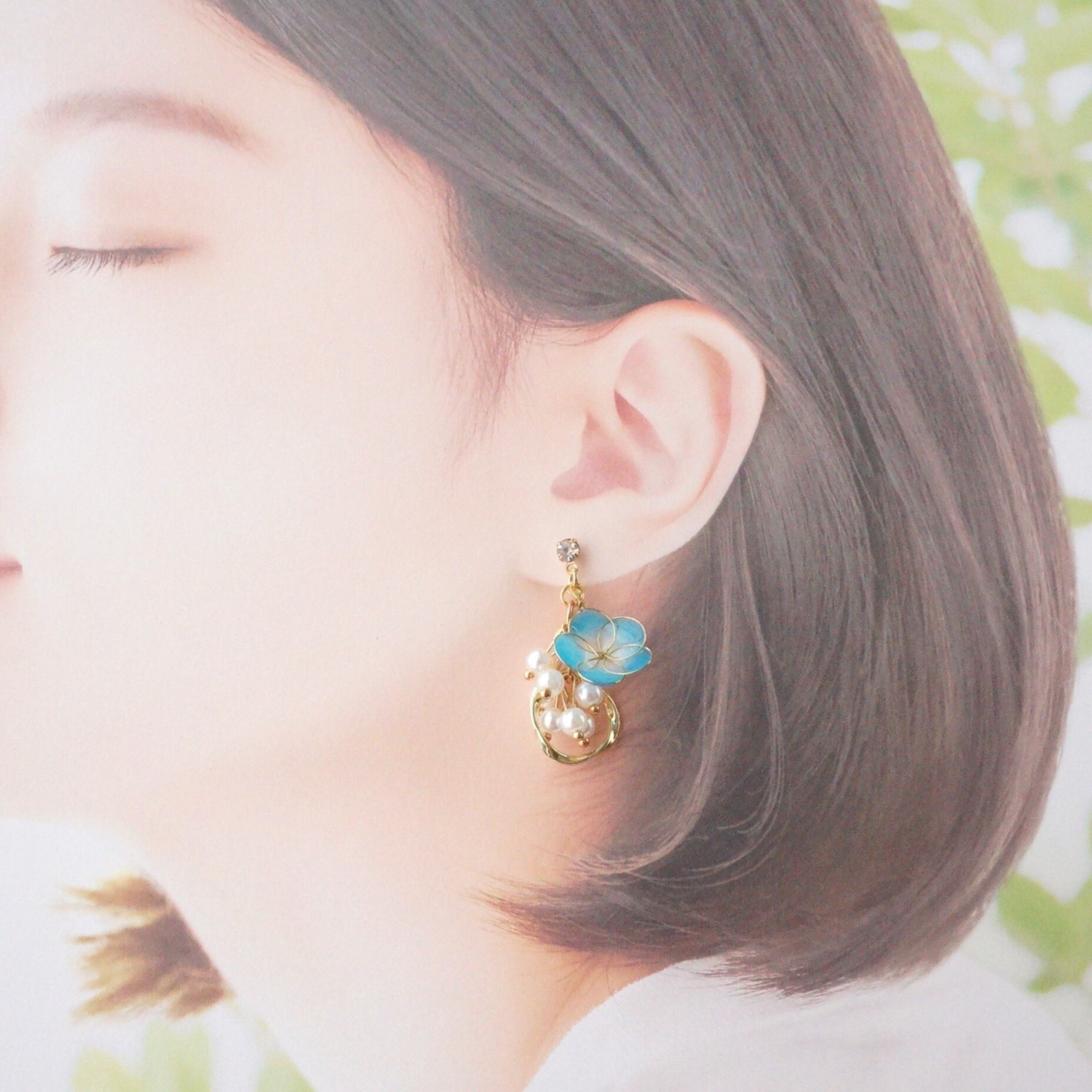 爽やかな青い花、小粒のパールビーズをしゃらしゃらと束ねてゴールドリングで上品さを表現。
