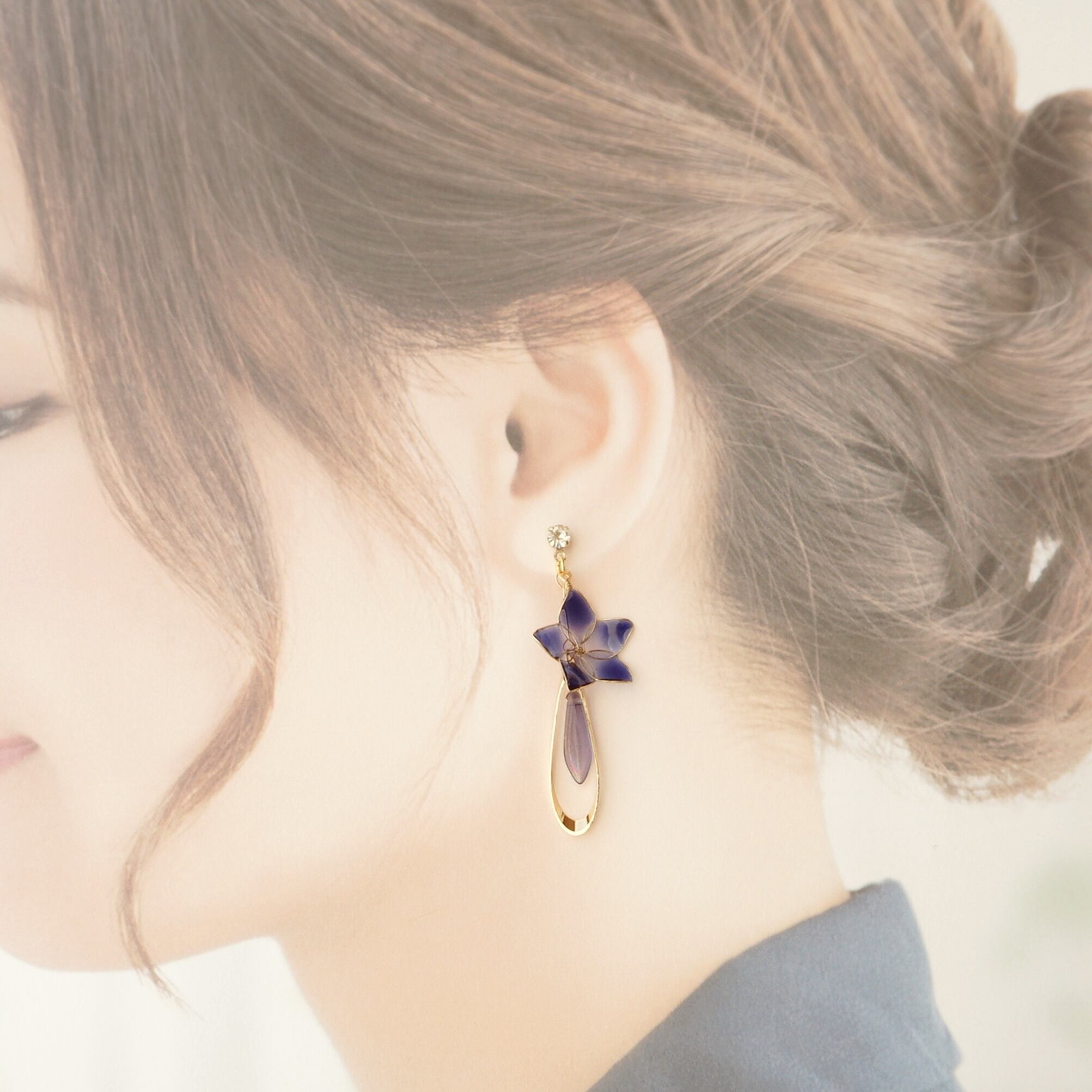 #イヤリング #アレルギー対応 #サージカルステンレス #ノンホールピアス #ギフトボックス #ギフトラッピング #無料ラッピング #オールシーズン #桔梗 #秋 #秋色 #ディップフラワー #紫 #パープル #フラワー #揺れる #チェーン #クリア #和装 #和服 #成人式 #卒業式 #浴衣