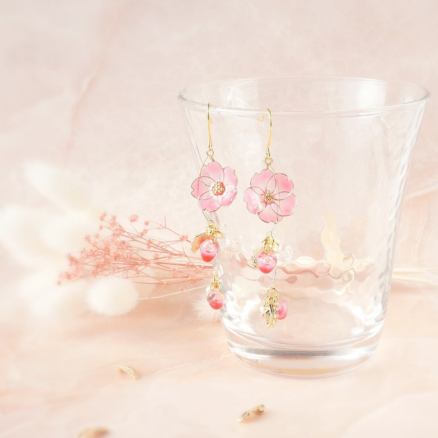 #イヤリング #サージカルステンレス #アレルギー対応 #ノンホールピアス #ギフトボックス #ギフトラッピング #無料ラッピング #オールシーズン #ディップフラワー #フラワー #揺れる #春 #桜 #びいどろ #和ガラス #ピンク #ガラス #クリア #花 #ガラス細工 #淡水パール