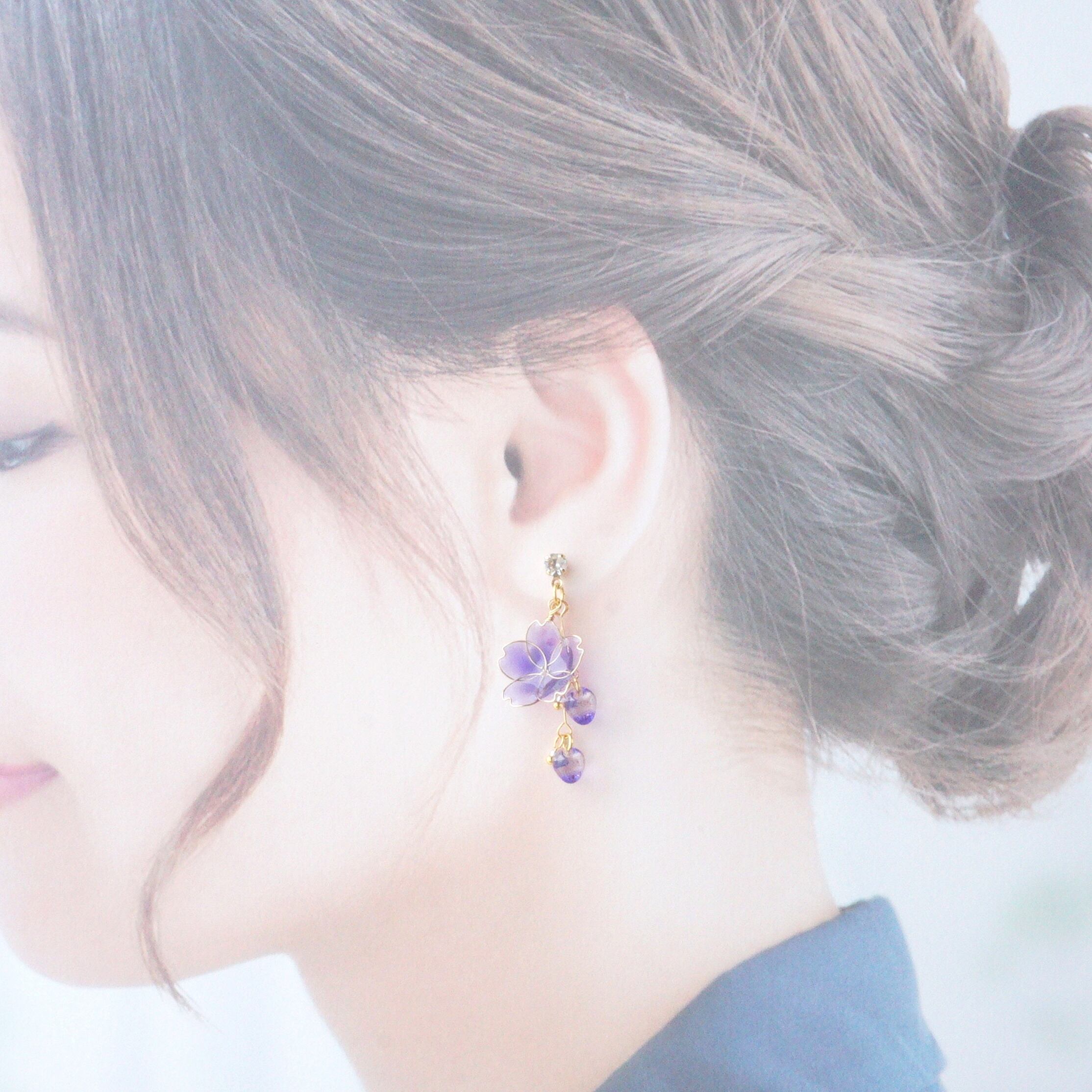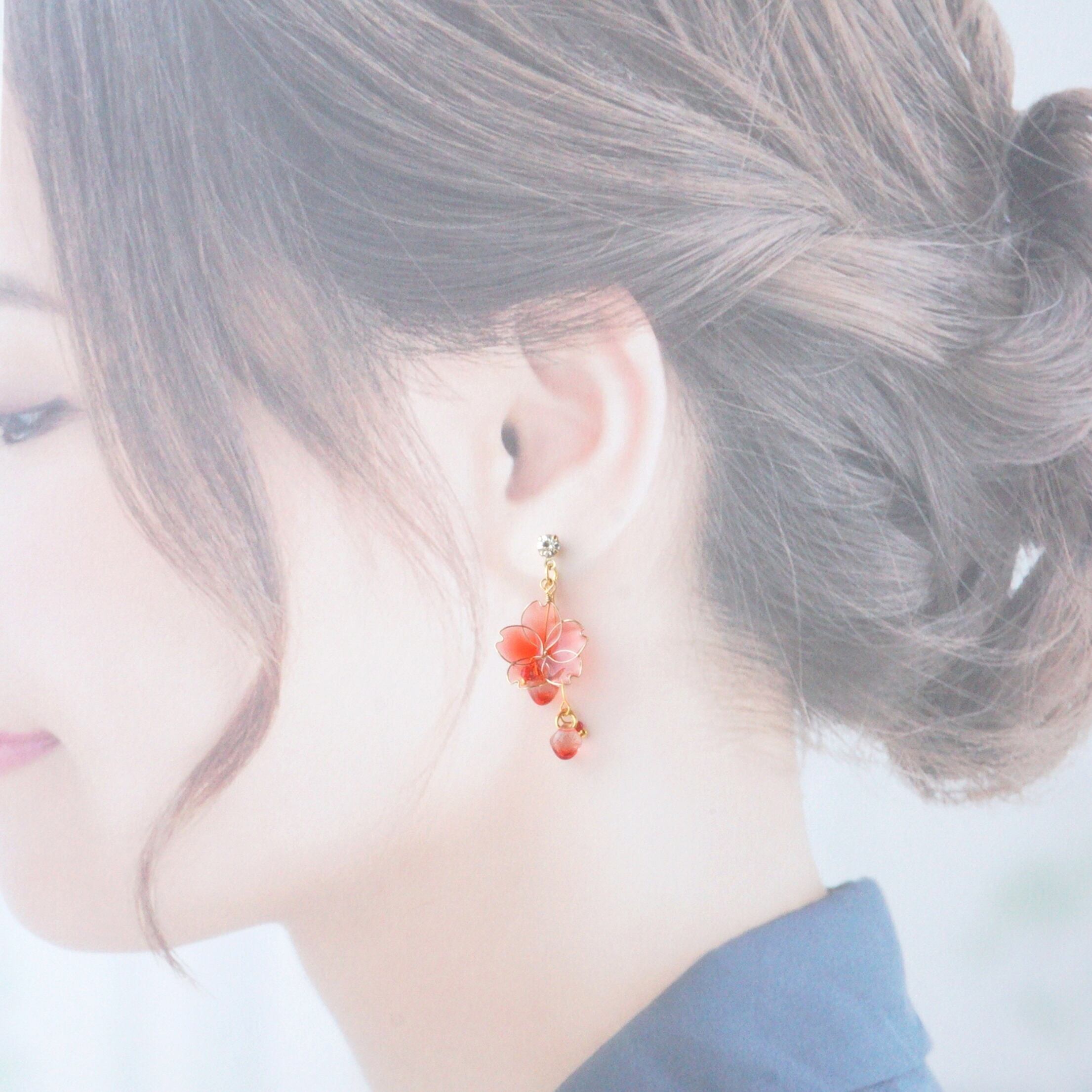#イヤリング #アレルギー対応 #サージカルステンレス #ノンホールピアス #ギフトボックス #ギフトラッピング #無料ラッピング #オールシーズン #ディップフラワー #フラワー #揺れる #和装 #和装コーデ #浴衣 #夏 #花 #色違い #赤 #青紫 #レッド #緋色 #パープル #紺藍 #桜 #夜桜 #夏祭り