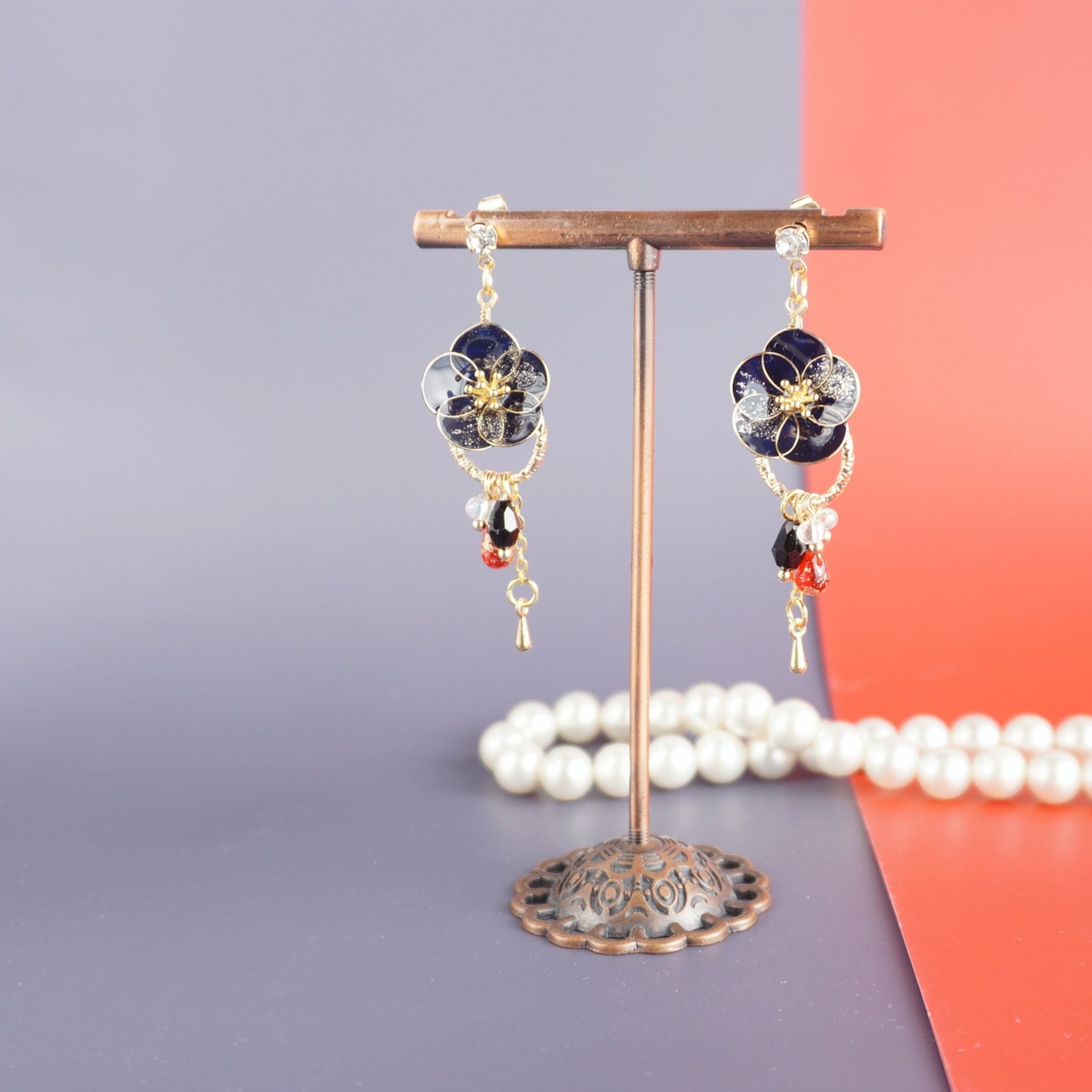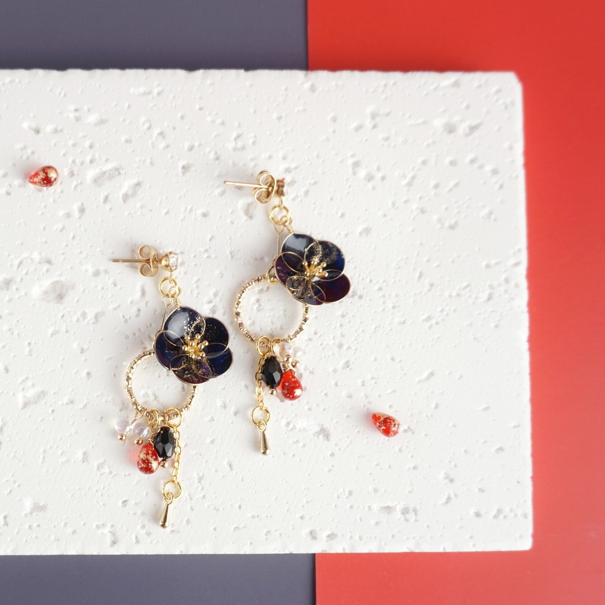 「星空に咲く藍梅」は、伝統的な梅の花に現代的なエッセンスを加えた、独特で美しいピアスです。