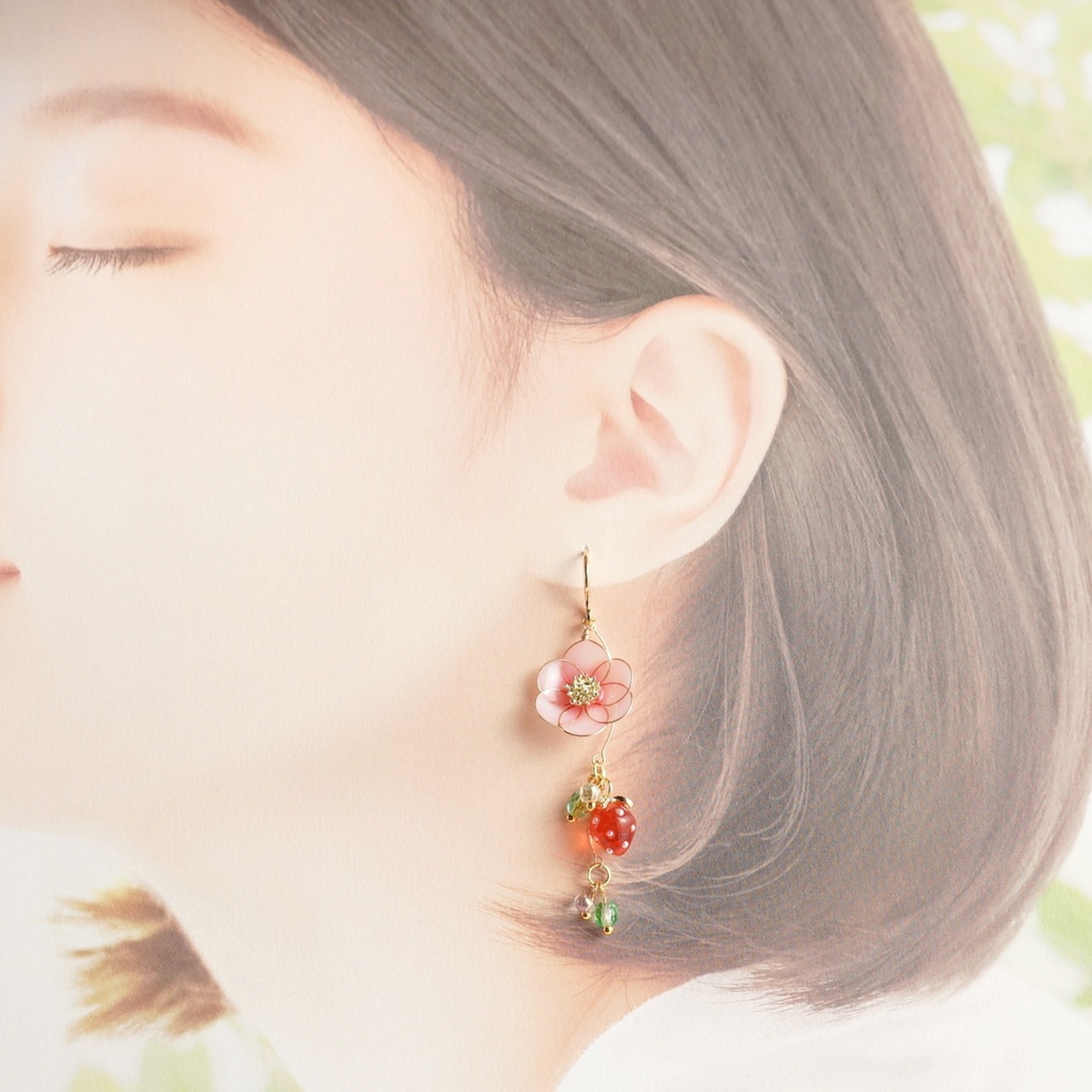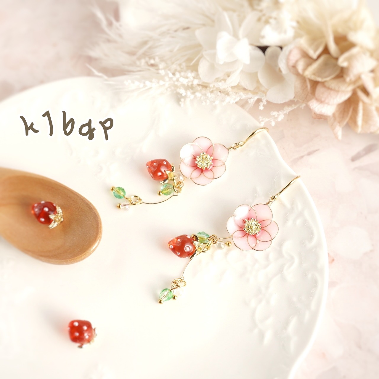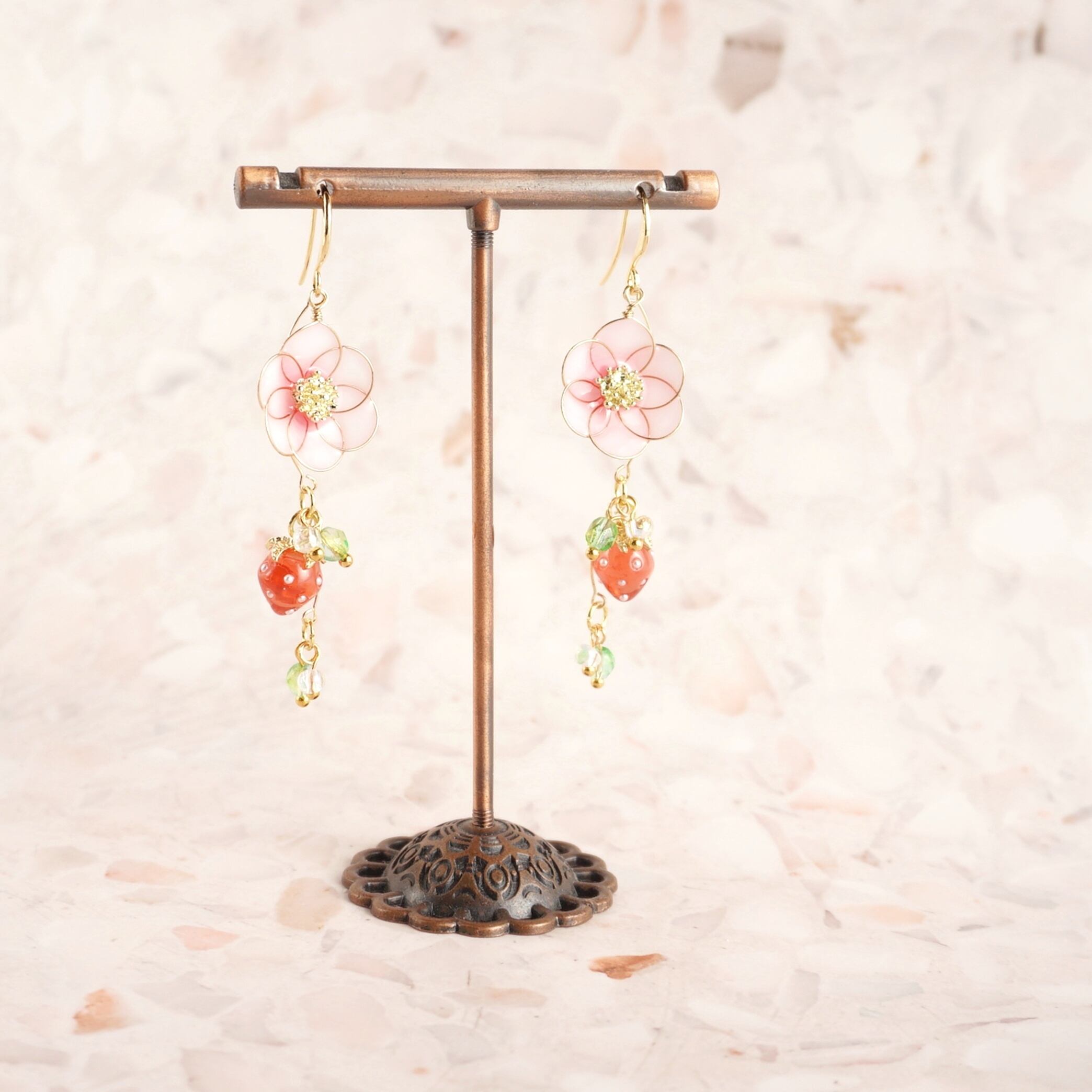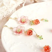 レジンで丁寧に作られたディップフラワーは、いちごの「桜香」の品種をモチーフにしており、ピンクの花と小さないちごチャームが揺れる、かわいらしいデザインのアクセサリーです。